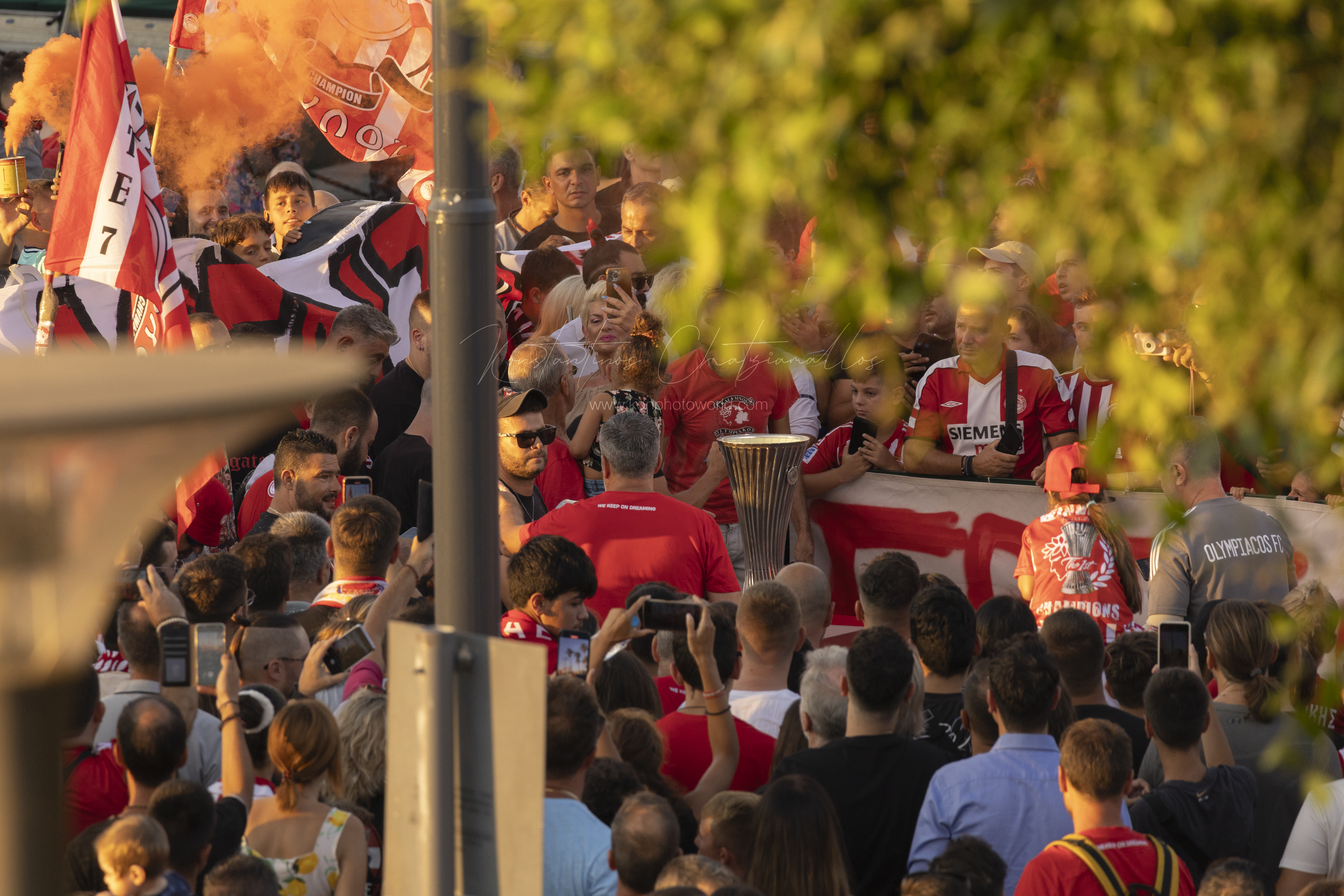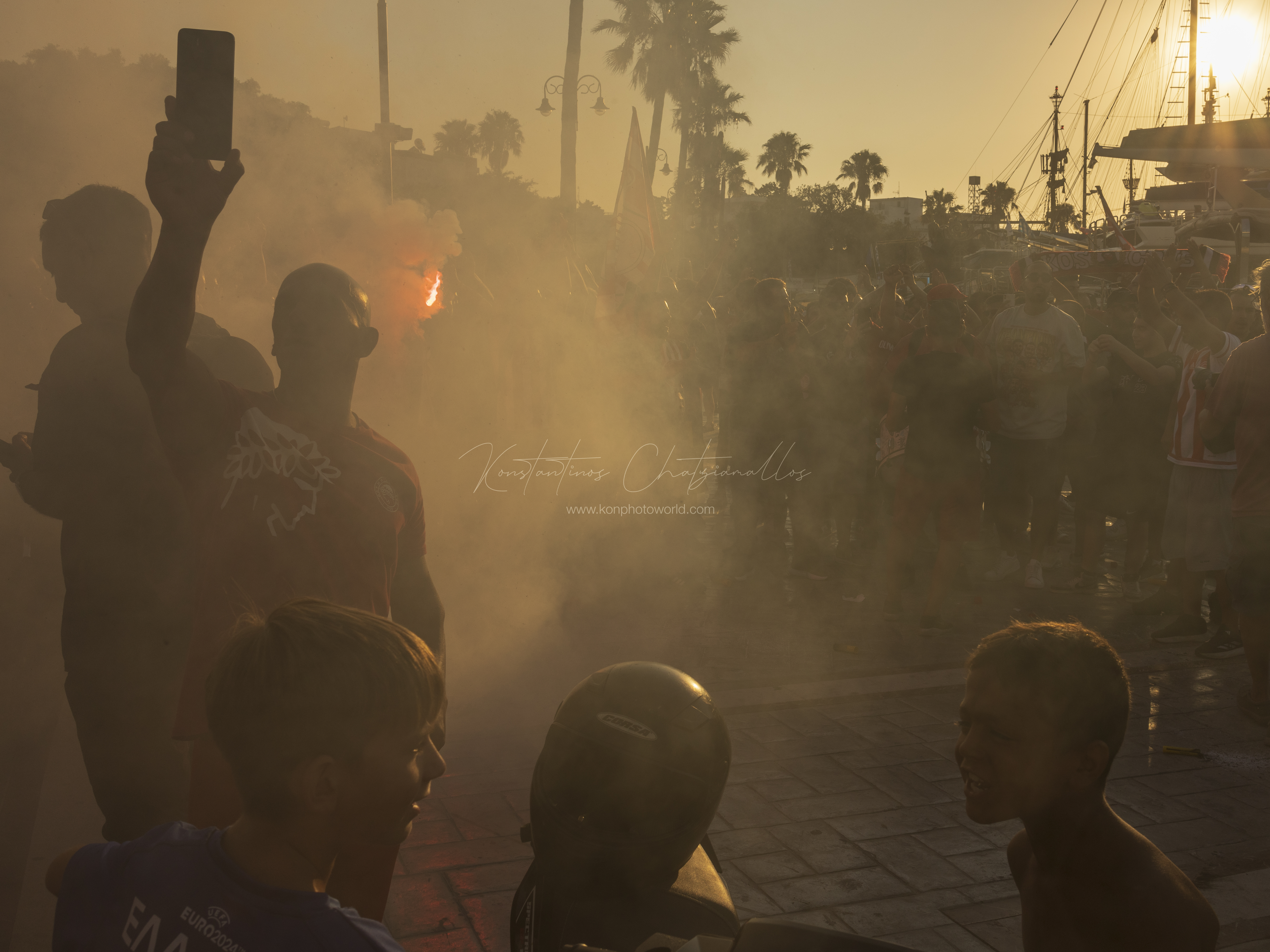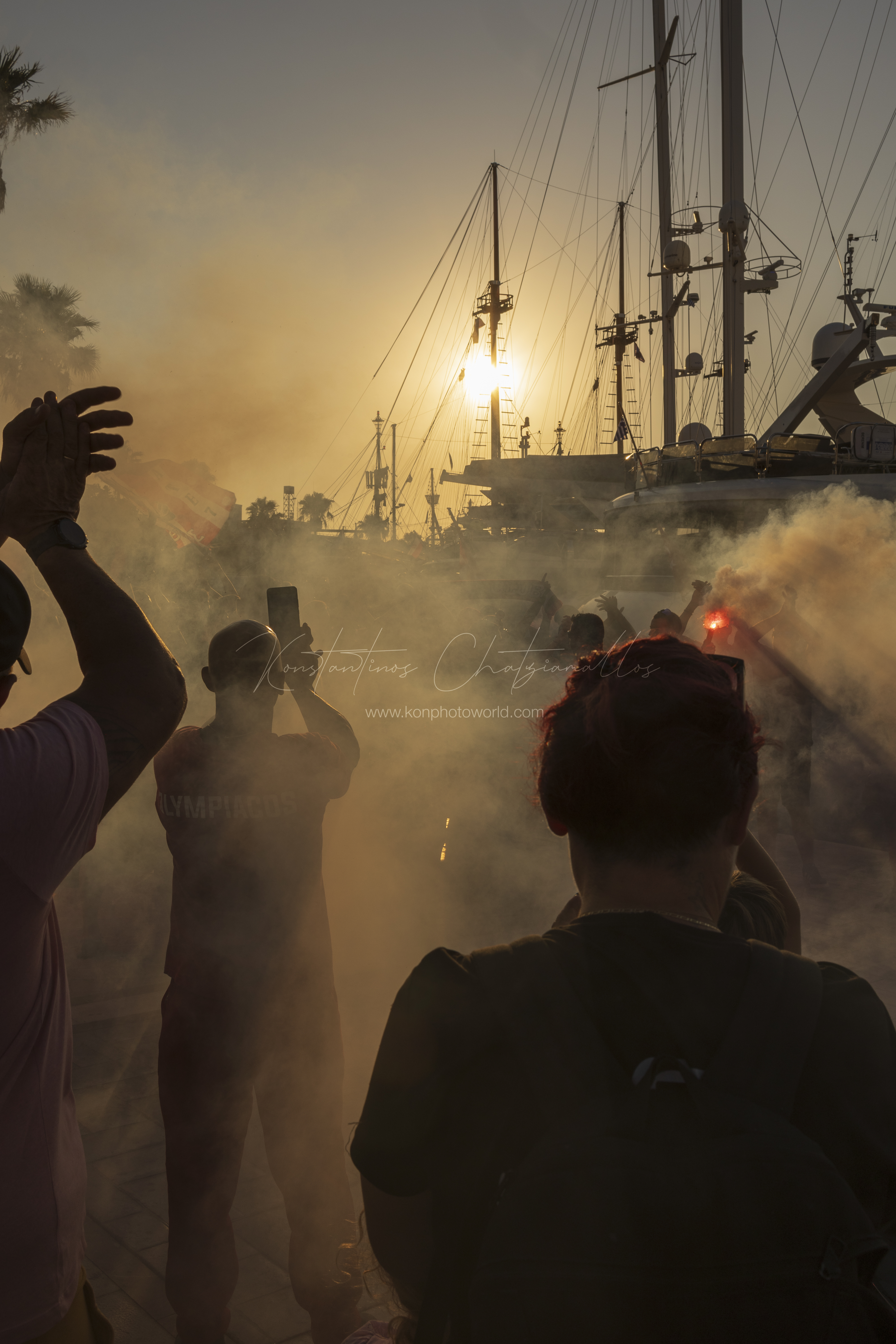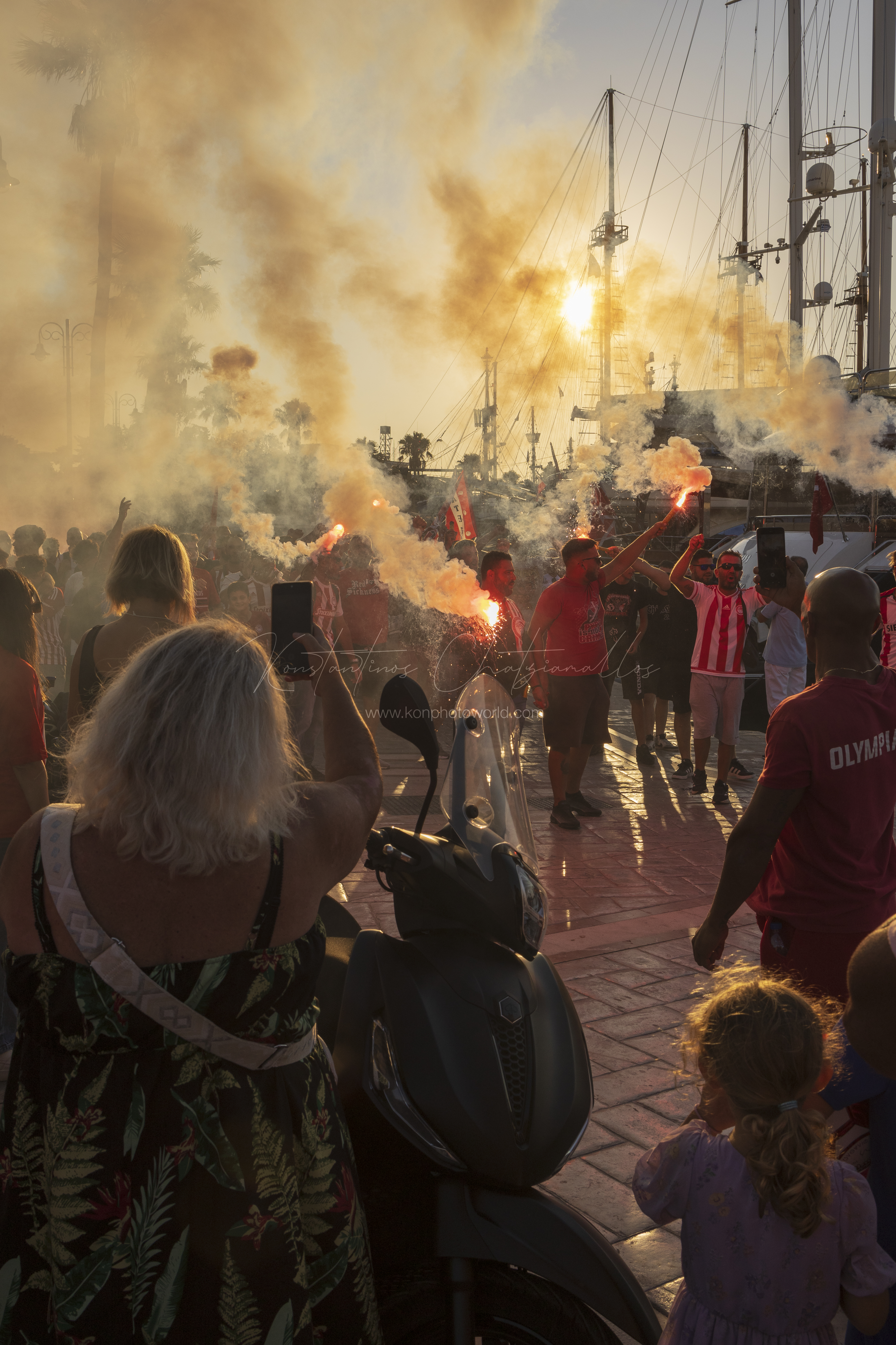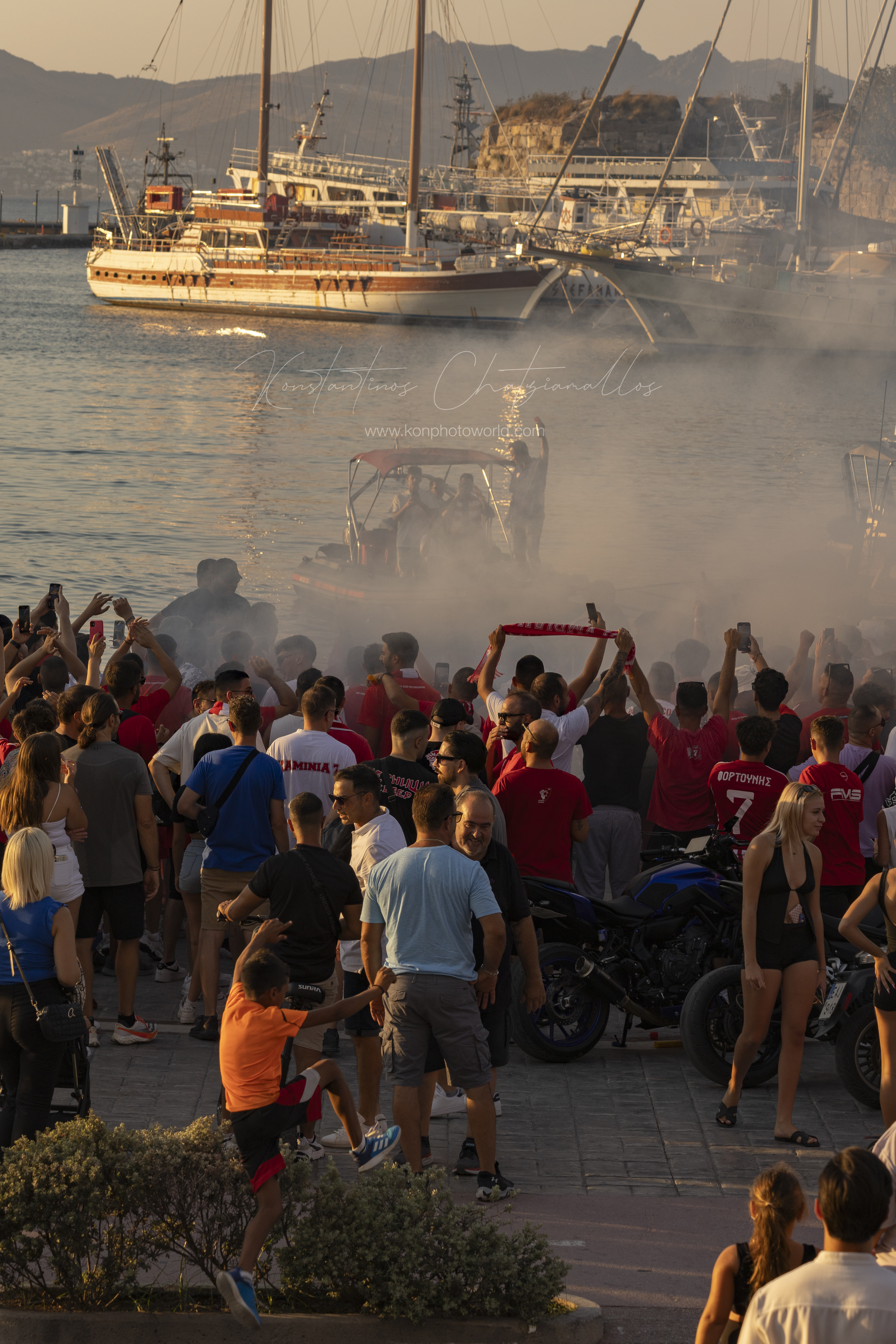 Φωτογραφίες που απεικονίζουν τον παλμό των φίλων του Ολυμπιακού Πειραιά κατά την υποδοχή και έκθεση, σε χώρο του λιμανιού της Κω, των πρώτων ευρωπαϊκών τροπαίων (Europa Conference League και Uefa Youth League) στην ιστορία του ποδοσφαιρικού τμήματος του συλλόγου (πρώτων και στην ιστορία του ελληνικού συλλογικού ποδοσφαίρου). Κόσμος και κοσμάκης, μικροί και μεγάλοι, με αθλητικά αλλά και γόβες, με καπνογόνα και σημαίες, μερικοί … στυλίτες, ακόμα και με αθλητικές φανέλες των Μάντσεστερ Γιουνάϊτεντ και … Σάντερλαντ!!! Όμορφες στιγμές, δυνατά συναισθήματα …